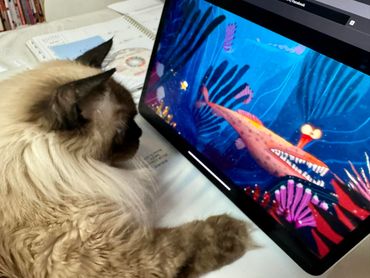 He is my constant companion that is very opinionated and loves to see cartoons in the studio. Yes, he gives approval on all my art