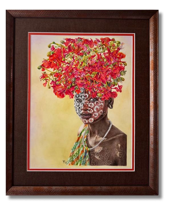 Wild Flowers depicts a young woman of Ethiopia’s Omo tribe, wearing a headdress of native blossoms. More than adornment, it symbolizes her people’s bond with the land, embodying strength, resilience, and timeless beauty.